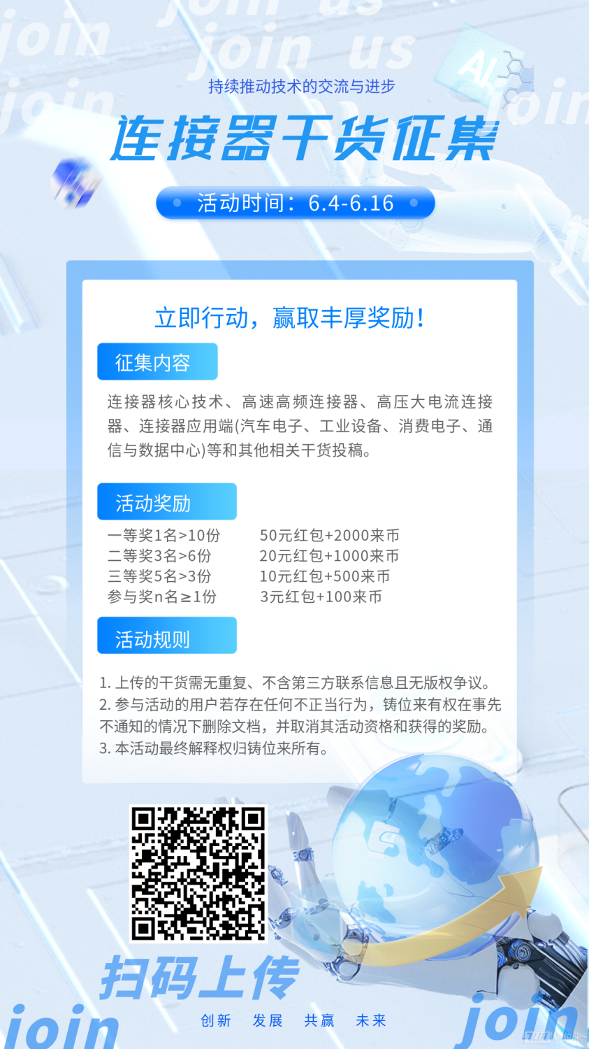 为了让更多工程师共享前沿技术成果,现正式启动"连接器专题"干货征集活动!无论您是连接器研发工程师、应用工程师,还是资深技术爱好者,只要您有独到的技术见解或实战经验,我们都诚挚邀请您参与!