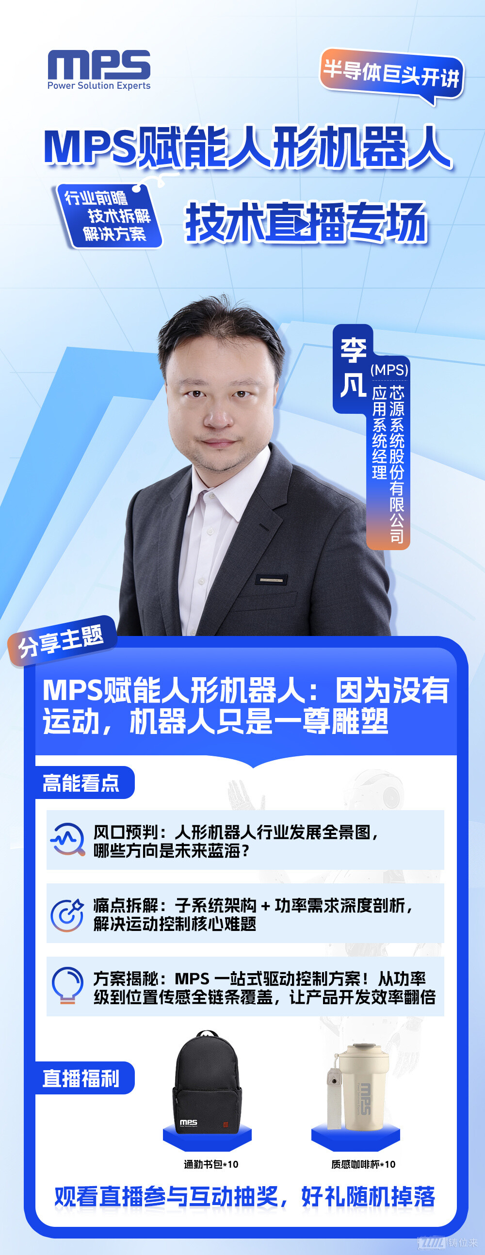 MPS(芯源系统股份有限公司)作为全球半导体领域的领军者,将于2026年1月16日14:00-15:00举办专场技术直播,由应用系统经理李凡深入解读“运动控制”这一机器人觉醒的核心密码。
